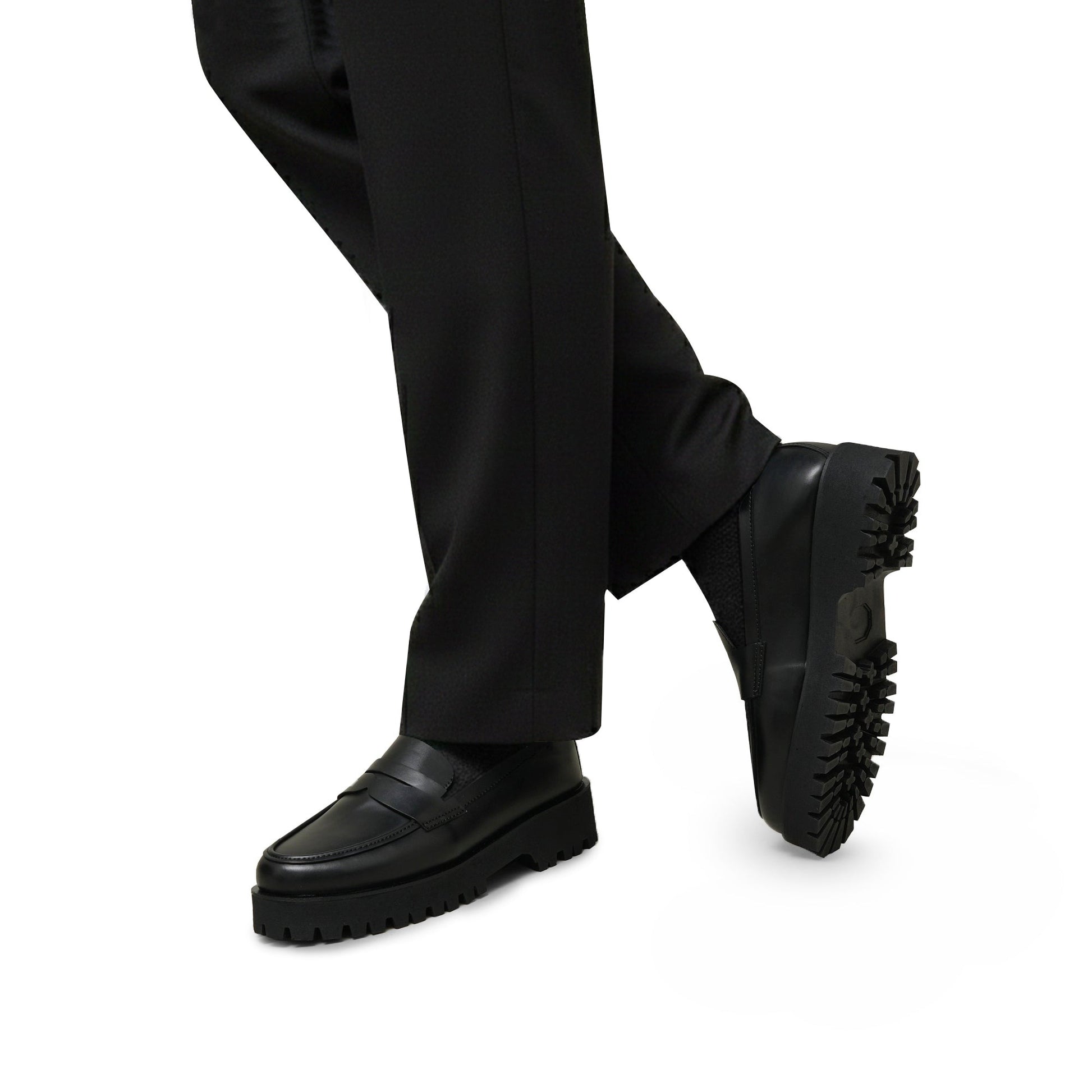 Step up your footwear game with these bold and stylish chunky platform loafers. Featuring a sleek black leather finish and a timeless penny loafer design, these shoes effortlessly combine classic elegance with a modern edge.