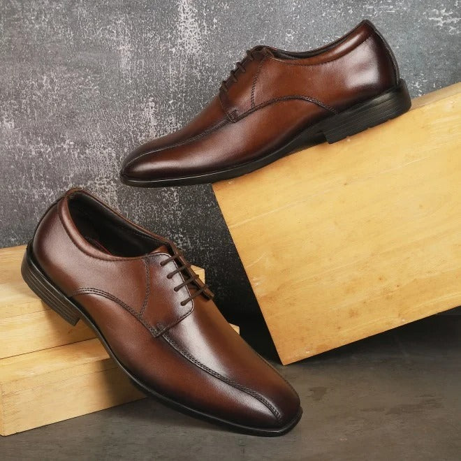 Dawn Edge, a classic leather derby shoe designed for modern formal wear. Made from smooth genuine leather, it features a clean plain-toe front with fine stitching that adds subtle detail without losing its elegant look. The open-lace design gives a comfortable, adjustable fit, making it ideal for long office hours, meetings, and formal occasions.