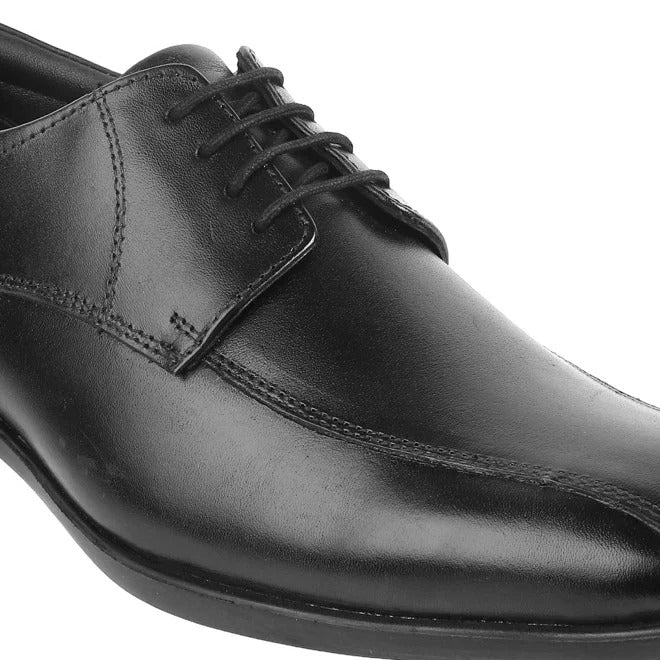 Midnight Edge, a classic leather derby shoe designed for modern formal wear. Made from smooth genuine leather, it features a clean plain-toe front with fine stitching that adds subtle detail without losing its elegant look. The open-lace design gives a comfortable, adjustable fit, making it ideal for long office hours, meetings, and formal occasions.